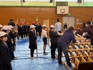 体験は、郷土学習の一環として行われ、児童は錦帯橋課職員のサポートを受けながら、楽しそうに部材の組み立てを行っていました。