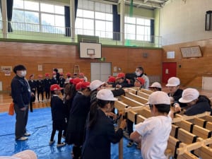 2月20日(金)に、岩国市立藤河小学校の3年生・4年生の児童を対象として、錦帯橋課職員による錦帯橋1/5模型の組立体験授業が行われました。